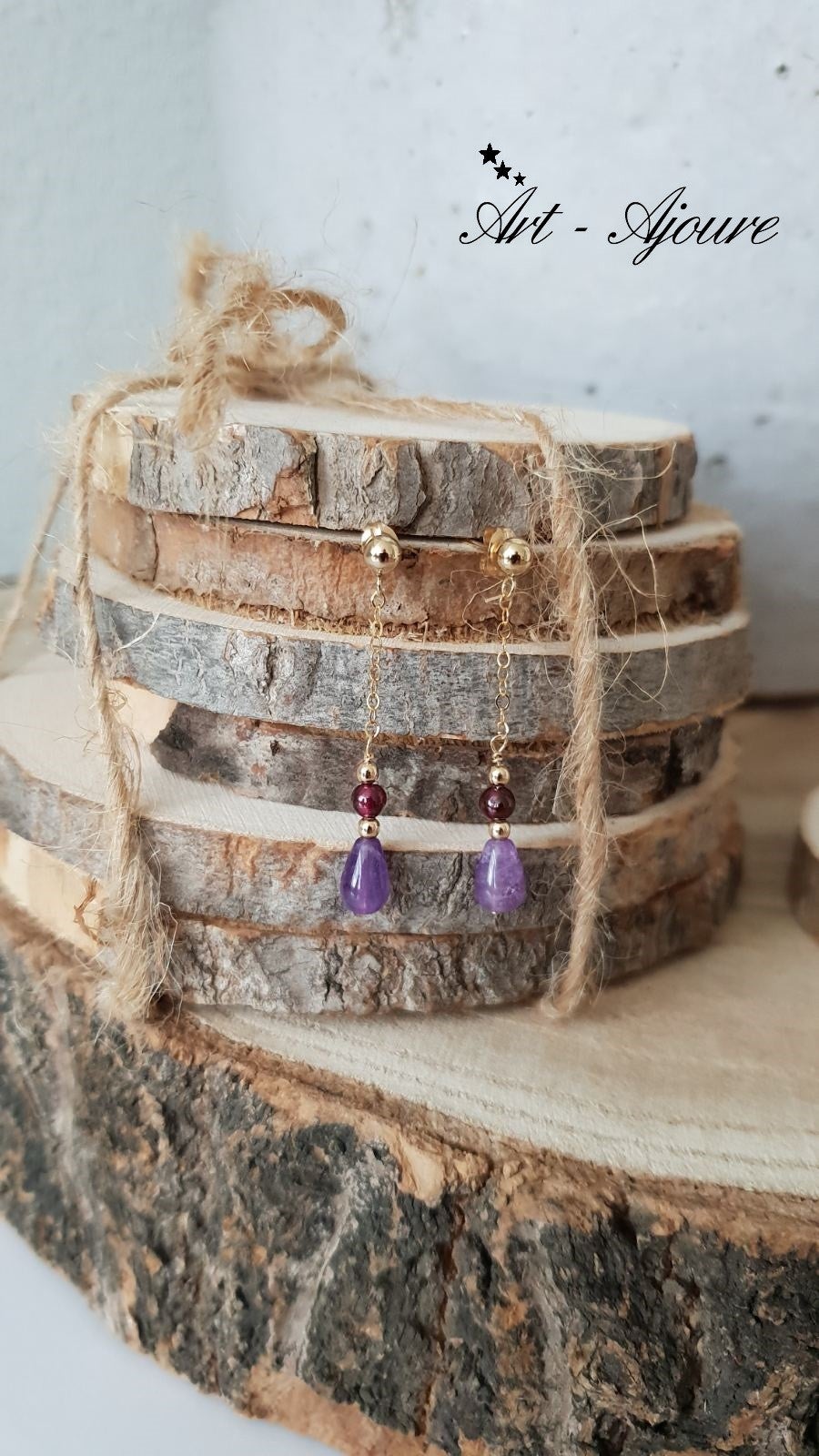 De oorknoppen zijn van 4mm kogels 14k gold filled oorstekers en 14k gold filled draad en ketting gemaakt met een Amethyst brioletjes en Granaat steentjes.
