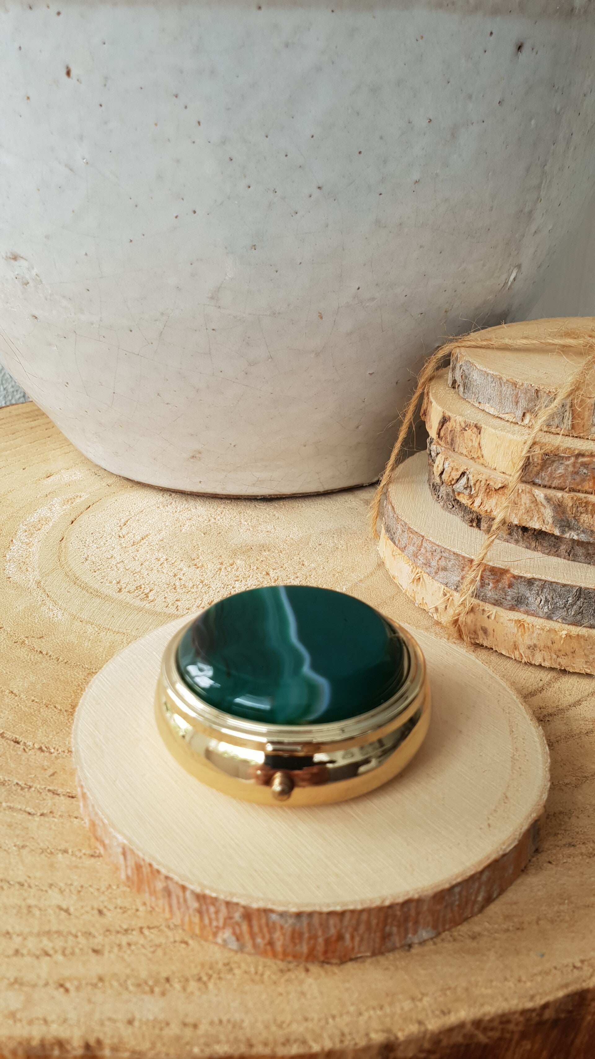 Rond sieraden doos van metaal met groene Agaat edelsteen en drie binnenvakken.