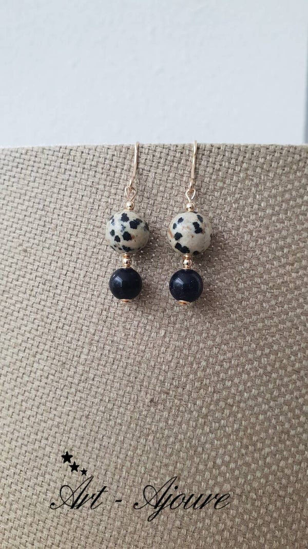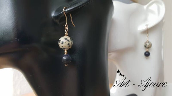 Art-Ajoure 14k Gold filled oorbellen met Dalmatiër jaspis en Blauwe Zonnesteen.