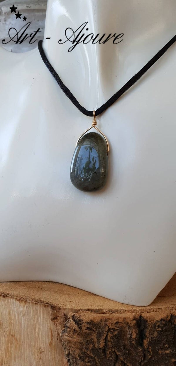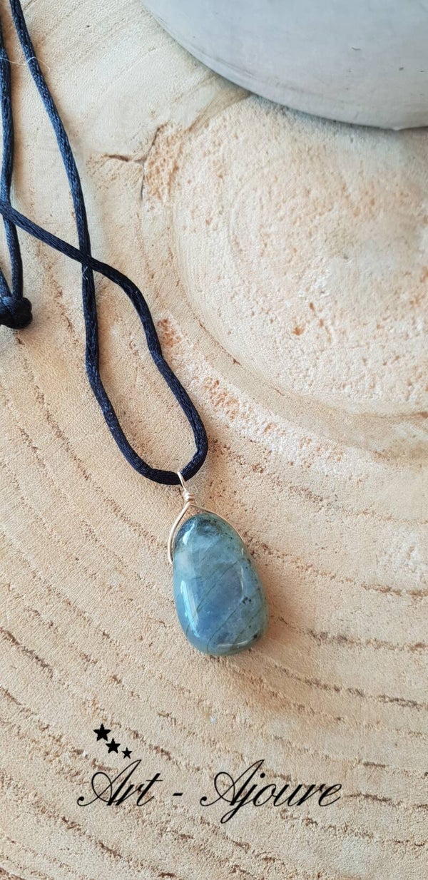 De hanger is sierlijk afgewerkt met 14k goldfill draad. De kleur van Labradoriet is verandert afhankelijk van de verlichting. Er zit blauw,groen en geel kleuren in.