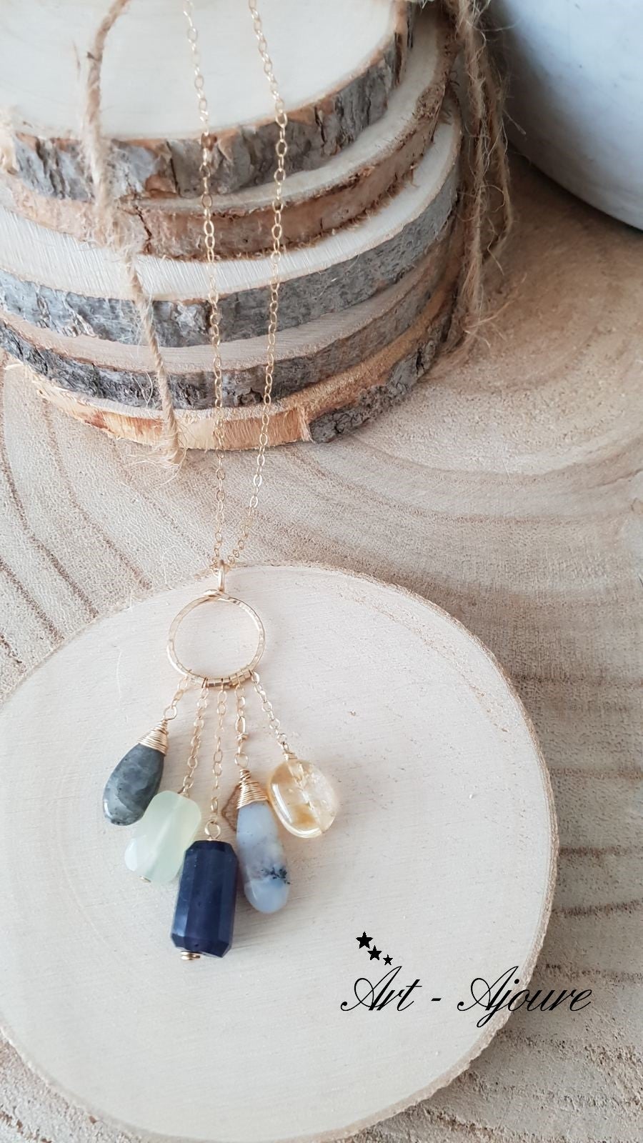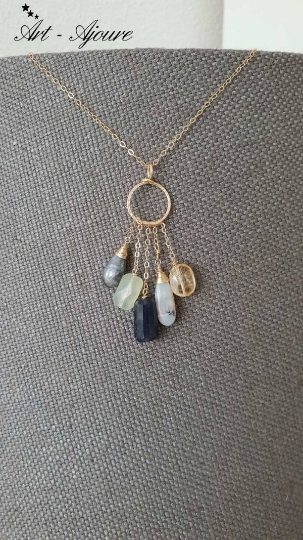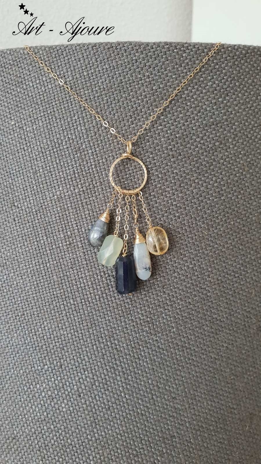 Art-Ajoure Goldfilled halsketting met hanger met Labradoriet, Opaal dendriet,Ioliet,Jade,Citrien.