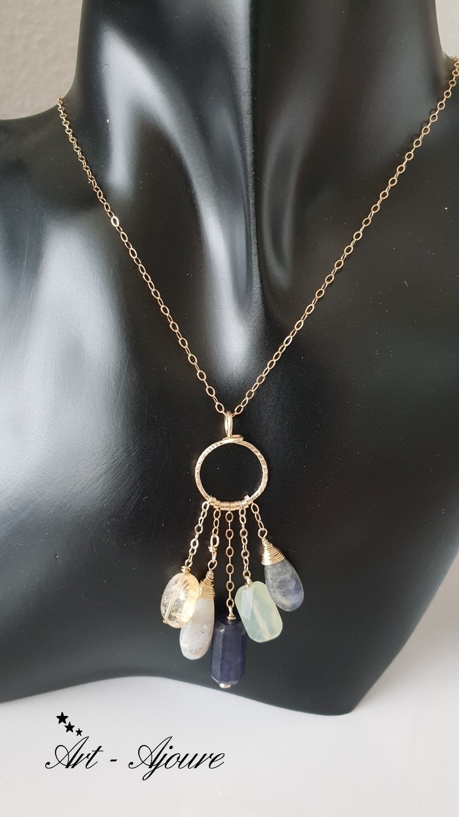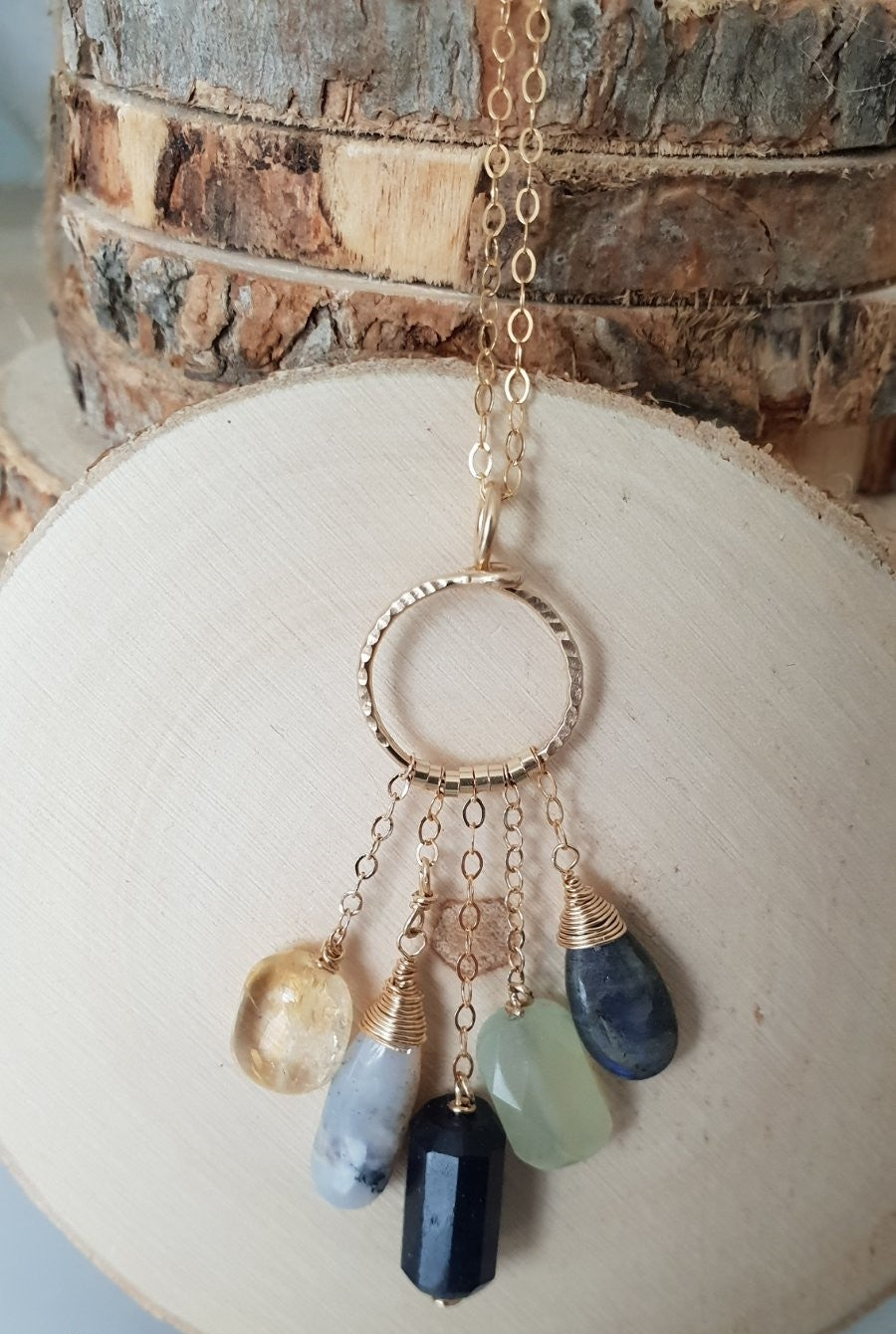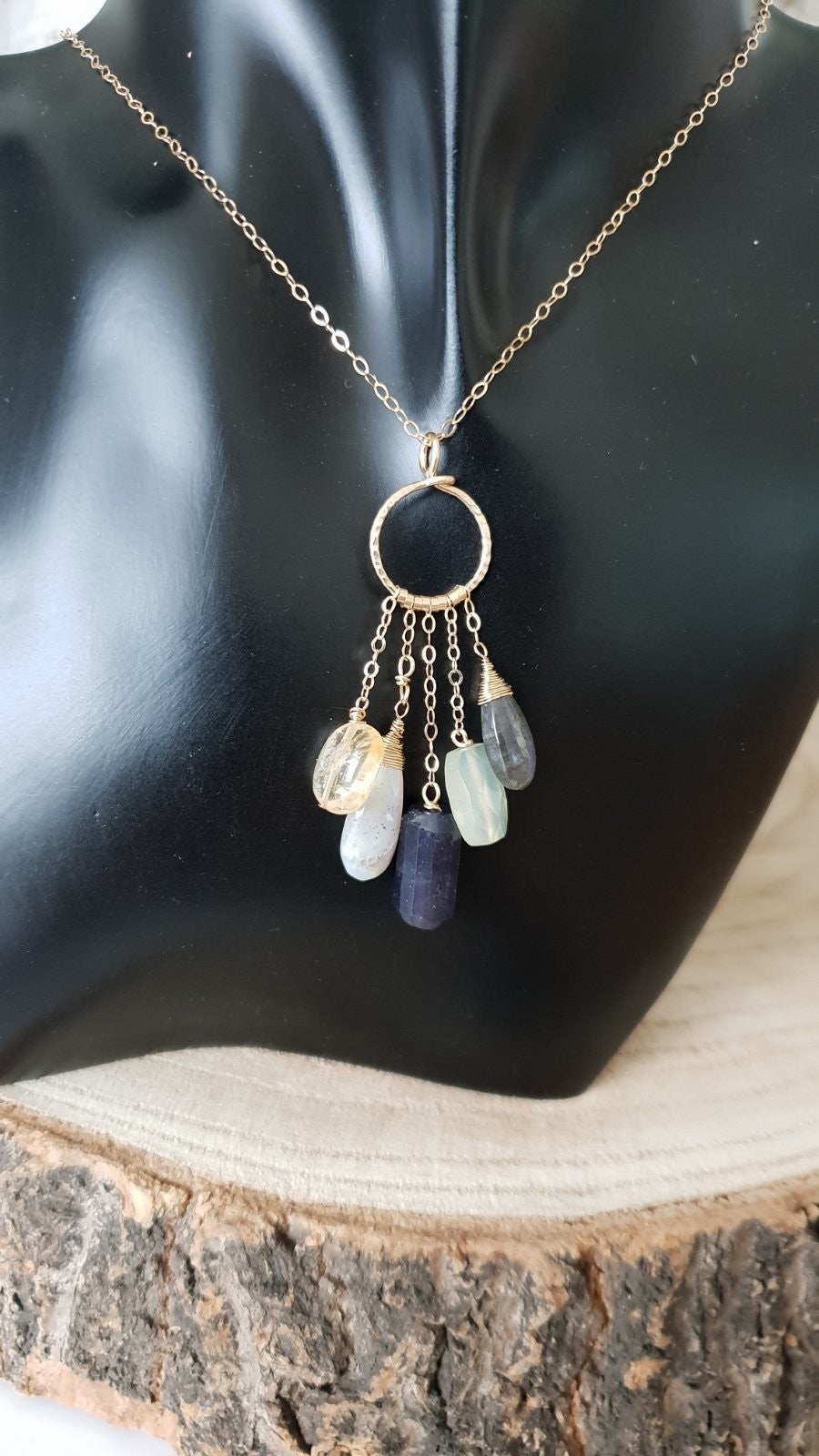 De hanger bestaat uit 5 verschilende edelstenen bevestigd met echt 14k goud Goldfill draad in verschillende vormen.