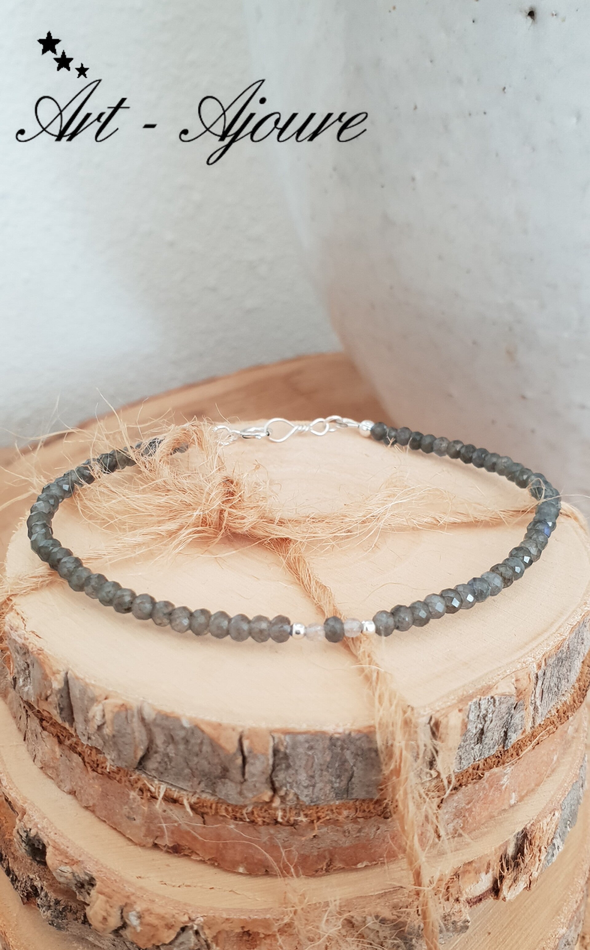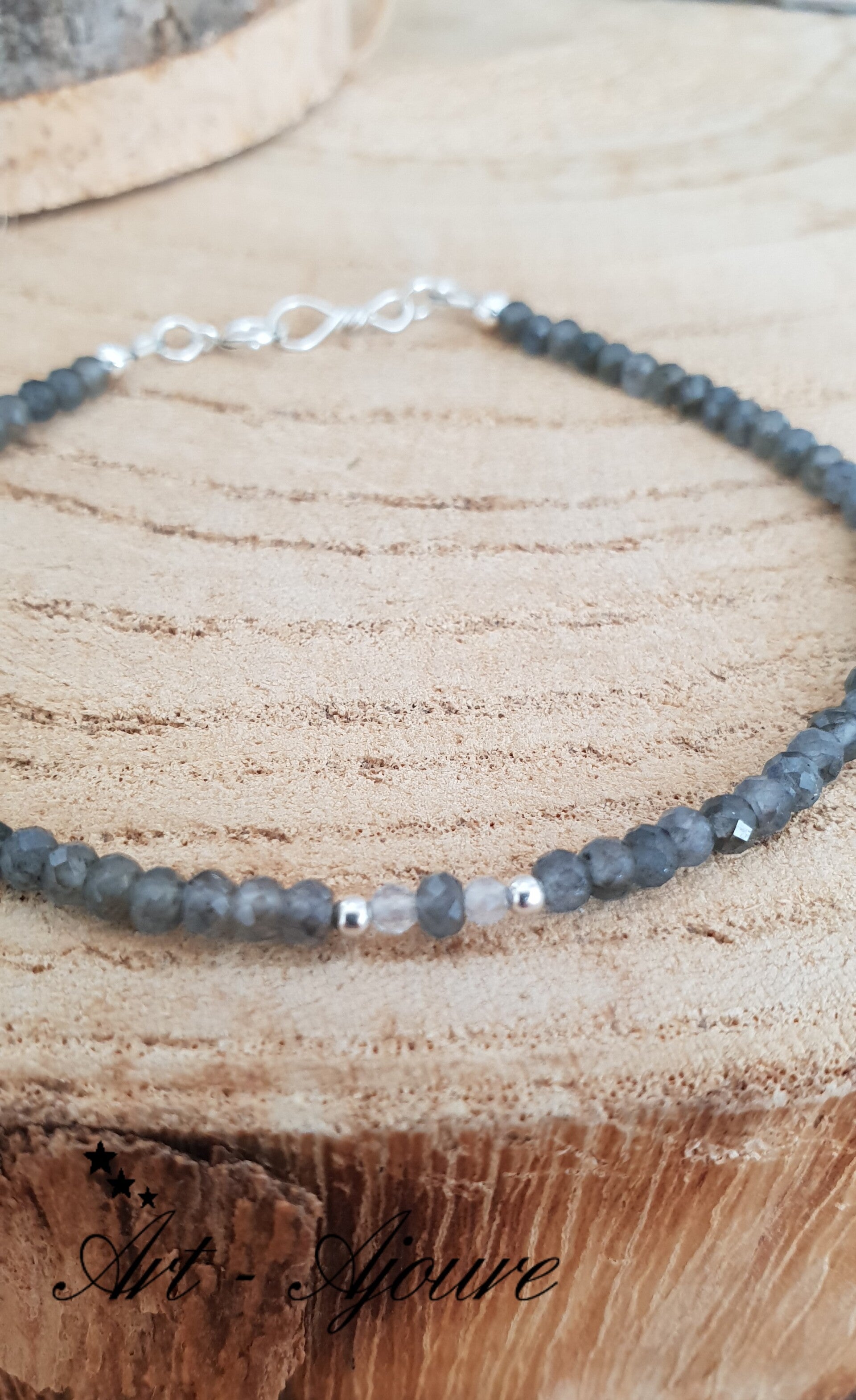 De armband bestaat uit 66 microfacetgeslepen Labradoriet edelstenen en 2 Maansteen van 3 x 5 mm elke en 925 Sterling zilver spacers.