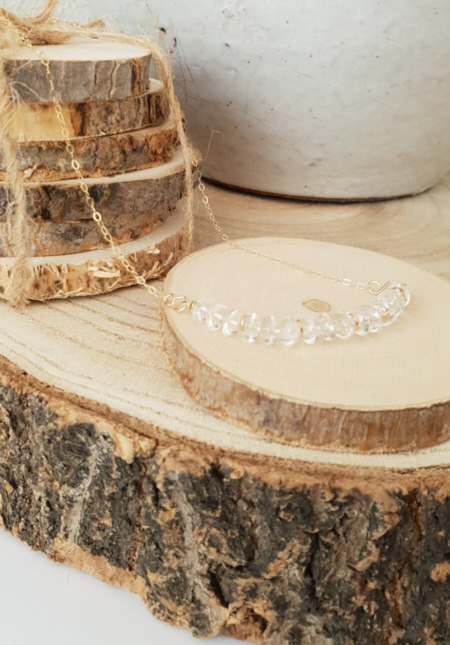 Handgemaakte 14k gold fill halsketting met mooie Bergkristal edelstenen. Deze halsketting met een totale lengte van 47 cm en heeft 8 cm van hanger met Bergkristal coins edelstentjes.