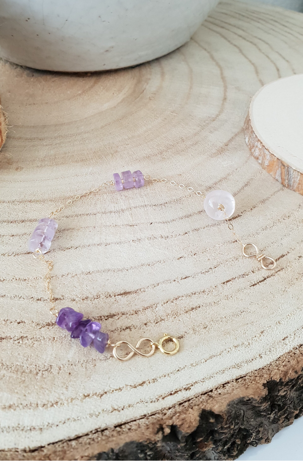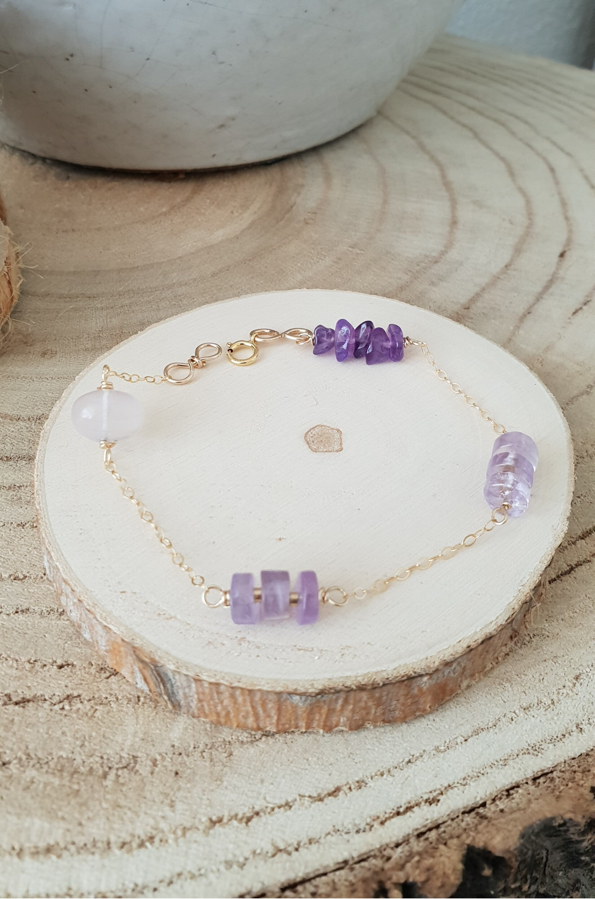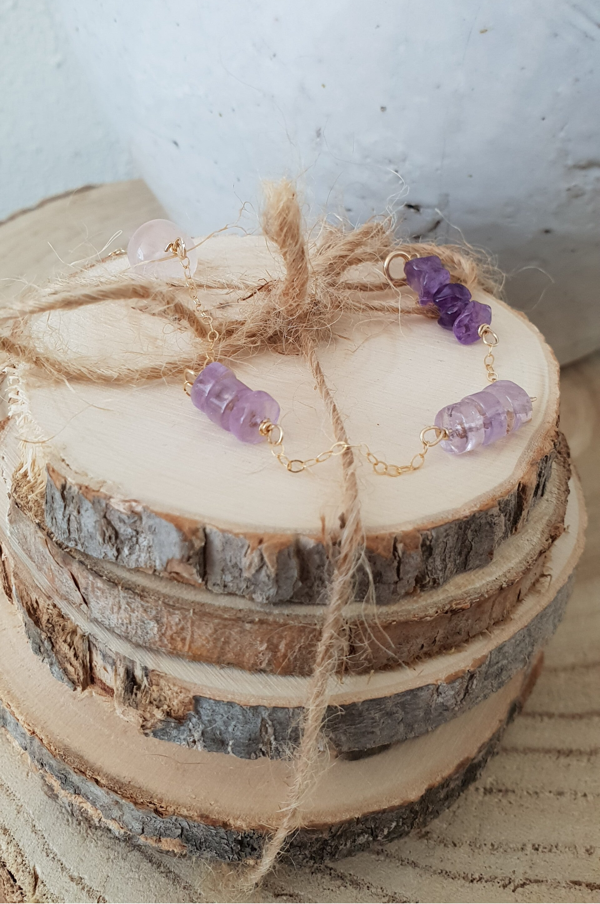 Een met de hand gemaakte 14k gold filled armband met Amethyst,Ametrien en Rozenkwarts edelstenen.