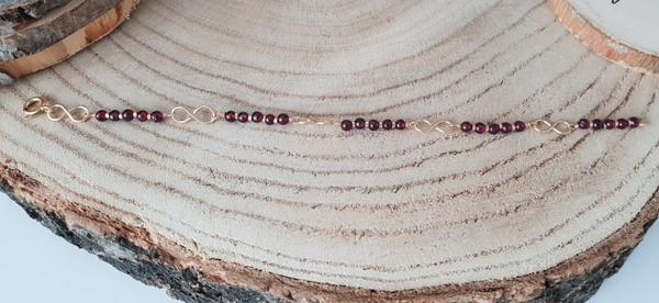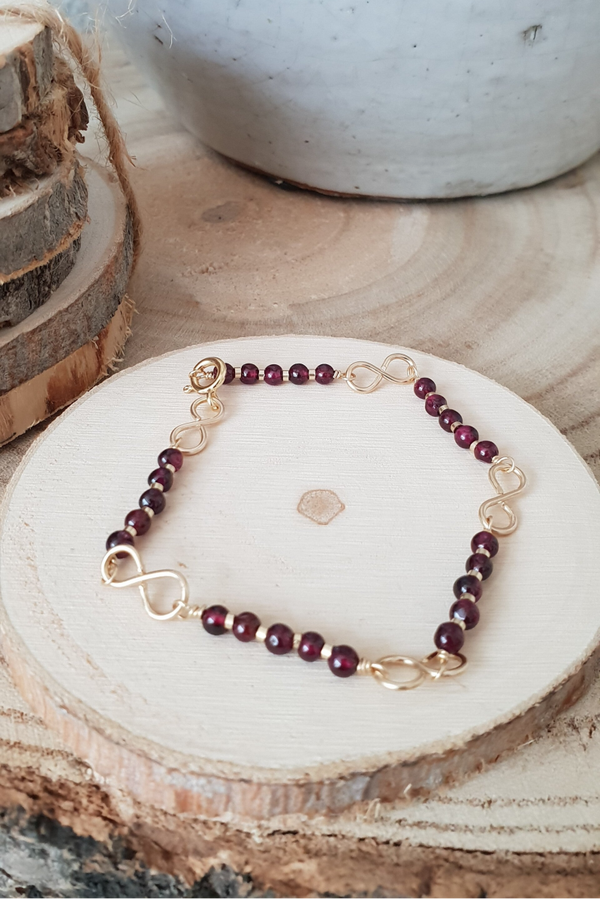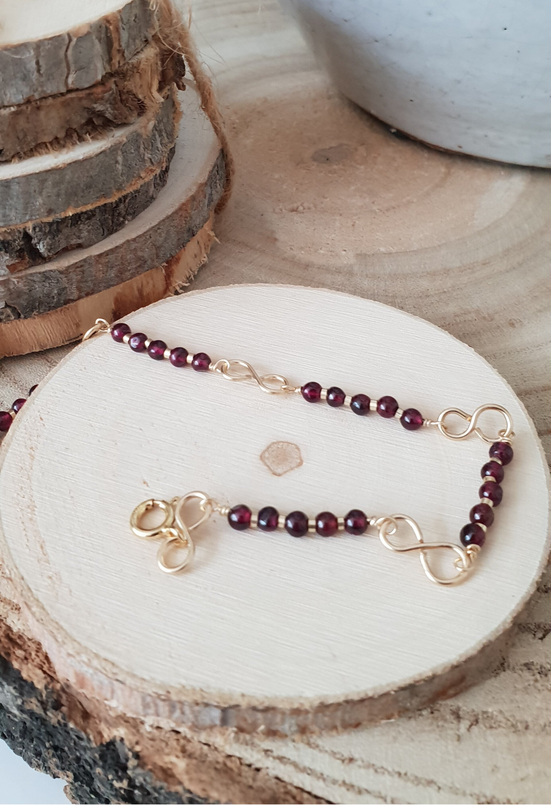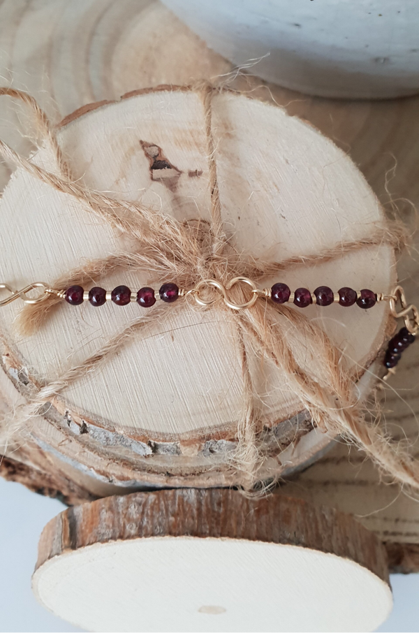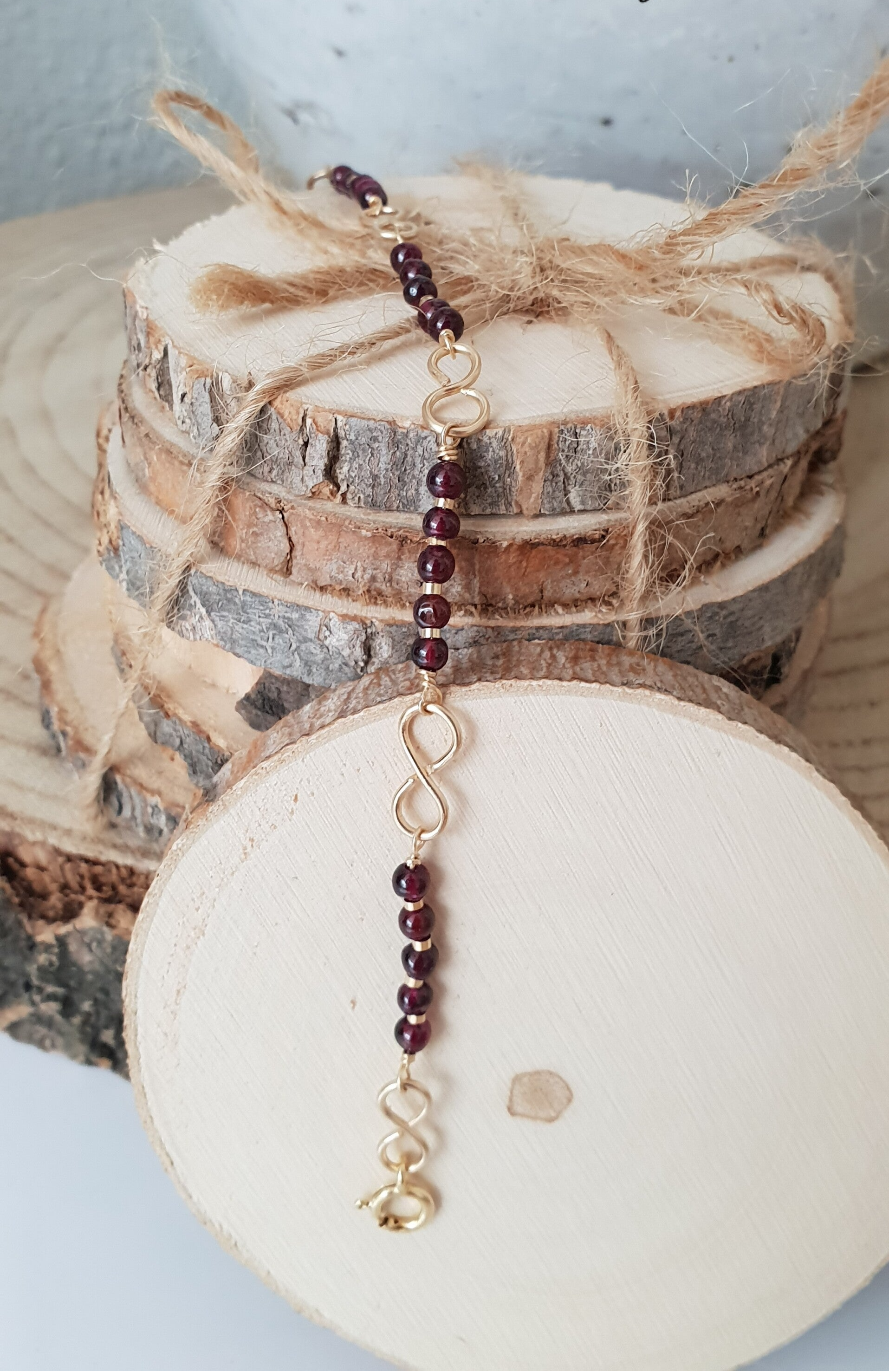 Een met de hand gemaakte 14k goldfill armband met kleine rode Granaat stenen en 14k goldfill kralen.