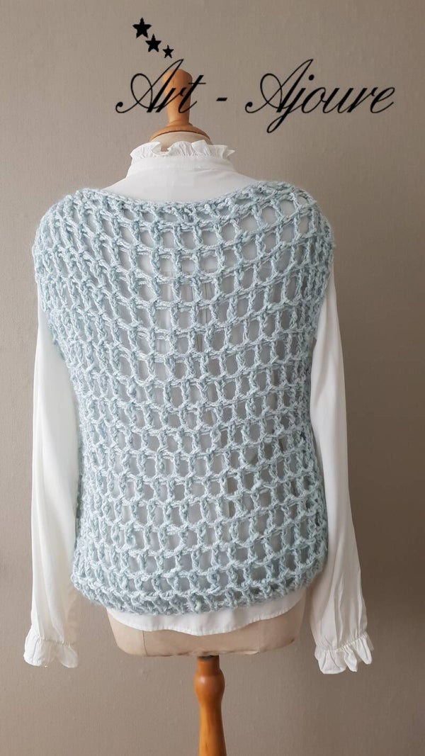 Een prachtig, elegant ajoure gilet, perfect voor zowel dagelijks gebruik als feestjes.Je kunt deze mooie gilet over een jurk of blouse dragen. Heeft geen knoppen.