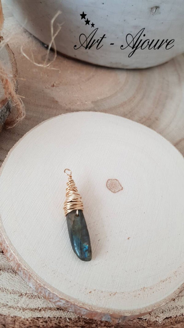 De hanger is sierlijk afgewerkt met 14k goldfill draad. De kleur van Labradoriet is verandert afhankelijk van de verlichting. Er zit blauw,groen en geel kleuren in.