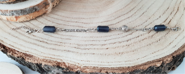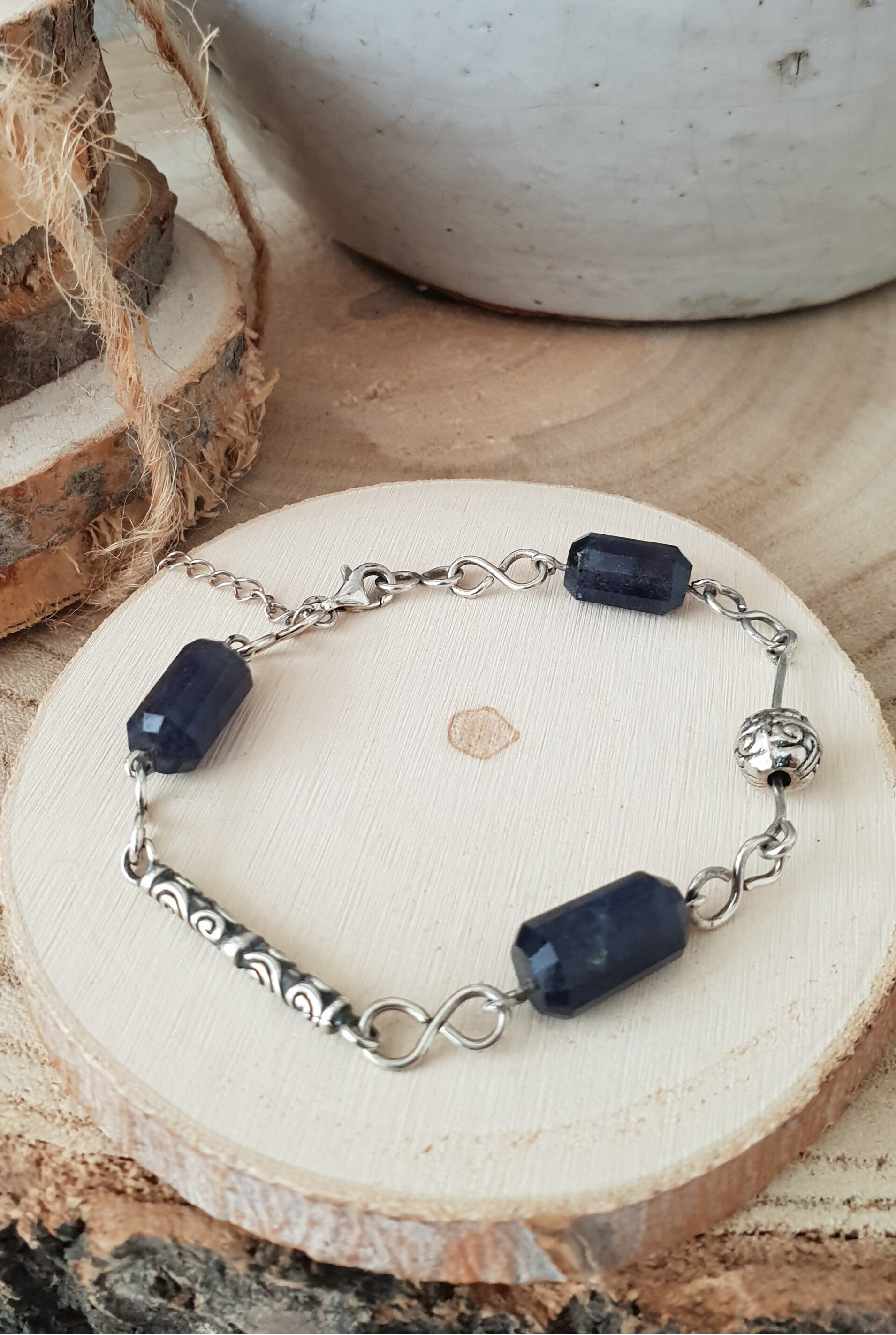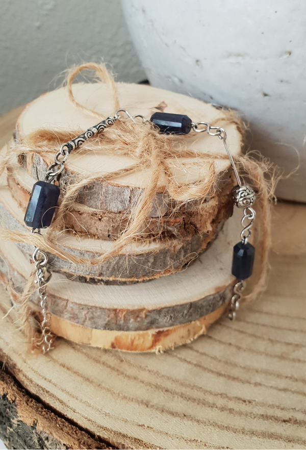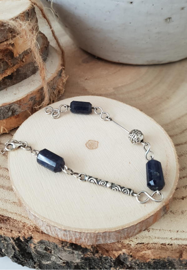 Een met de hand gemaakte zilveren armband met Ioliet edelstenen.Het zilver is geoxideerd. Het donkere uiterlijk van geoxideerd zilver geeft sieraden een vintage uitstraling.