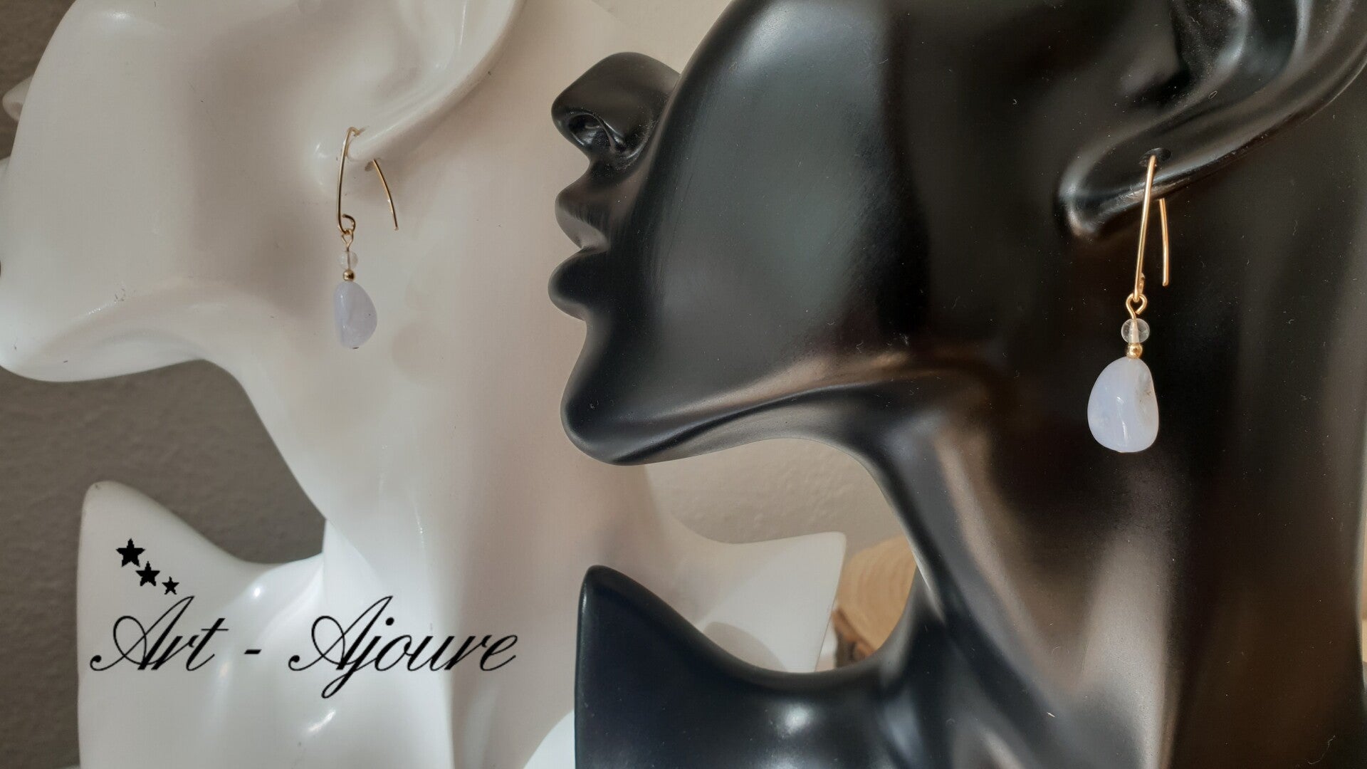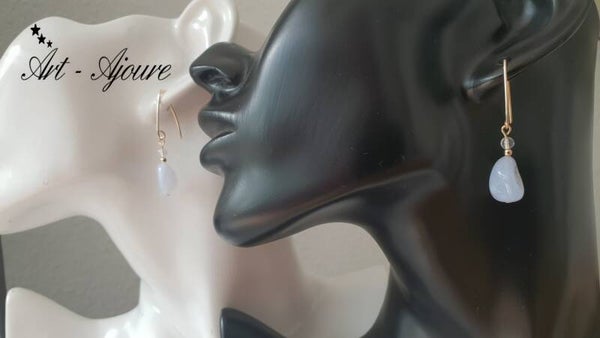 Hand gemaakte Art-Ajoure 14k goud gold filled oorbellen met Chalcedon en Bergkristal stenenen.
