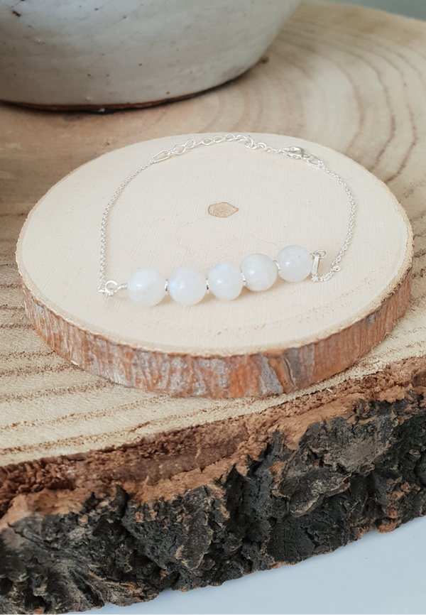 Dit armbandje heeft Maansteen parels op een zilveren ketelstift van 4 cm.