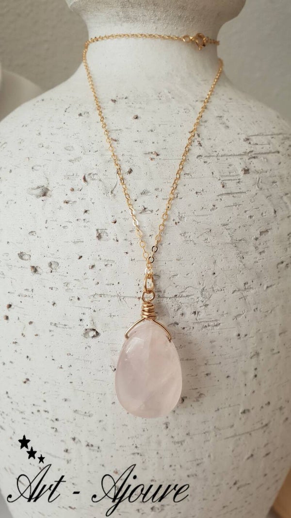 De hanger bestaat uit 1 Rozenkwarts edelsteen bevestigd met 14k goud Gold filled draad.