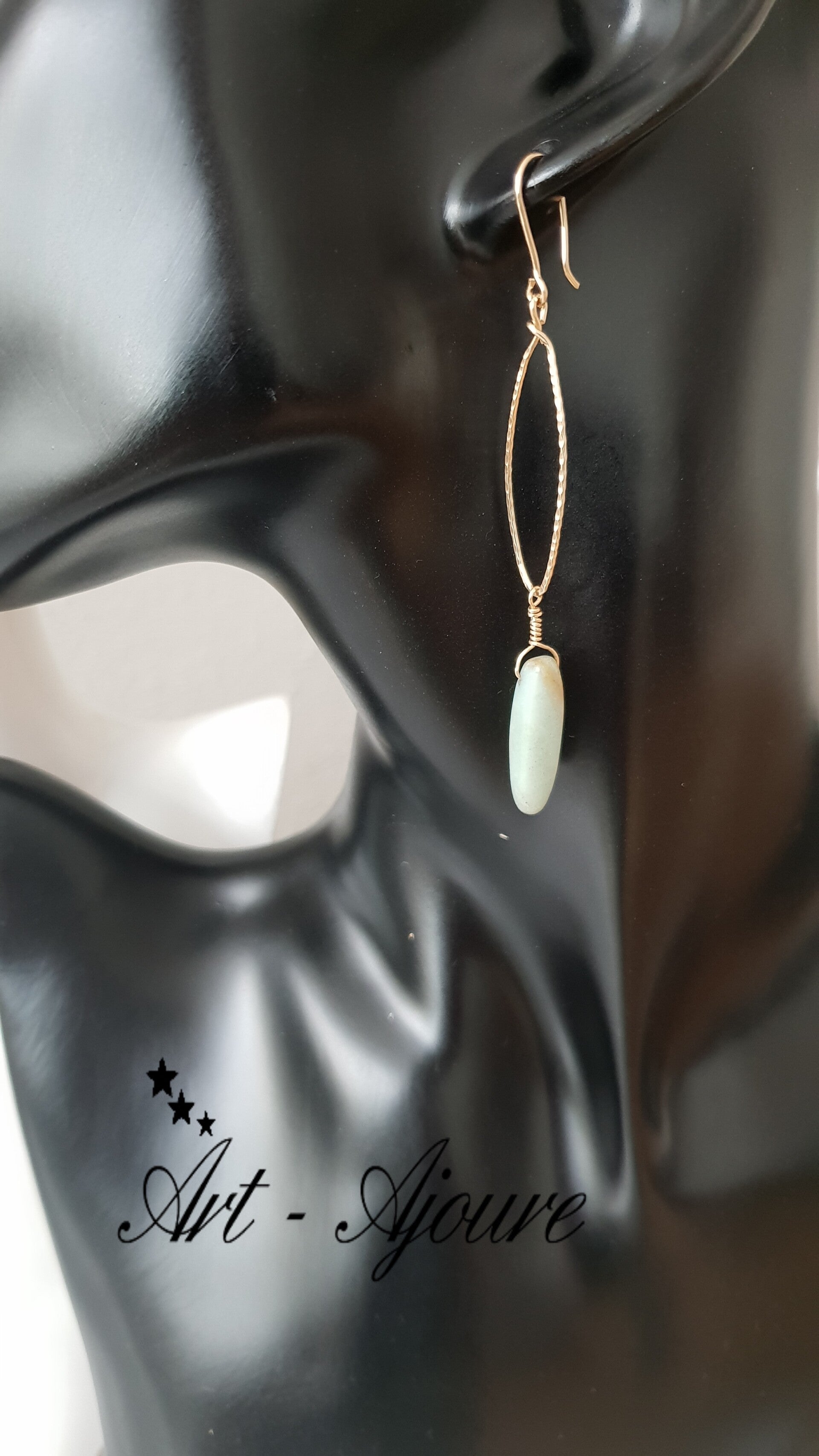 Handgemaakte Art-Ajoure 14k Gold fill oorbellen met Amazoniet van maar liefst 8 cm lengte. De oorbellen zijn sierlijk afgewerkt met 14k Gold fill draad met ornamenten en een mooi passend Amazoniet briolettes.