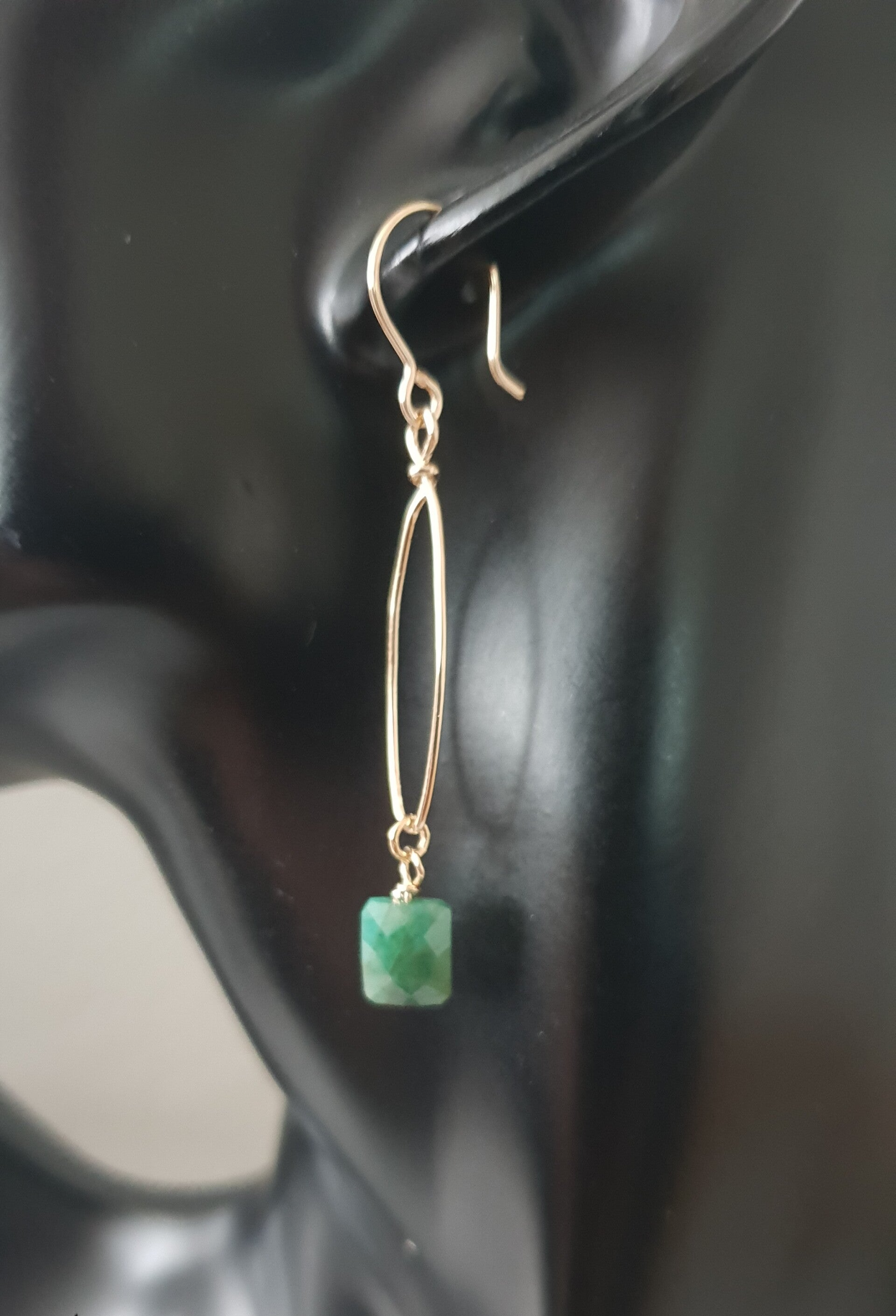 Handgemaakte Art-Ajoure 14k Gold fill oorbellen met Smaragd van maar liefst 6 cm lengte. De oorbellen zijn sierlijk afgewerkt met 14k Gold fill draad en een mooi passend Smaragd brioletten.