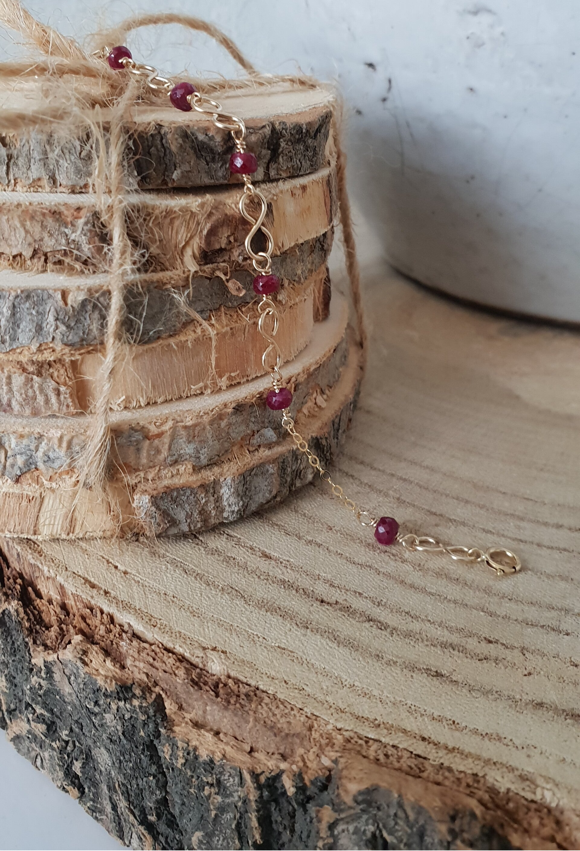Een met de hand gemaakte 14k goldfill armband met Robijn stenen en 14k goldfill kralen.