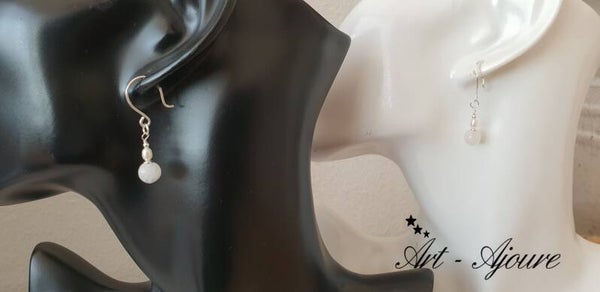 Hand gemaakte kleine Art-Ajoure zilveren oorbellen met Maansteen en Zoetwaterparels.