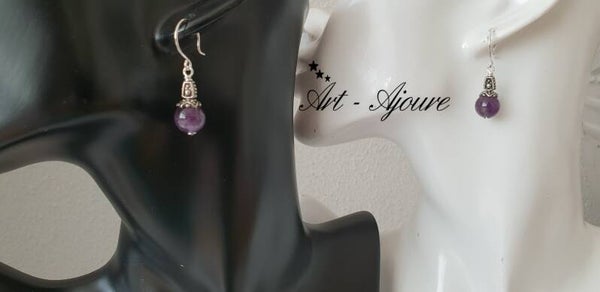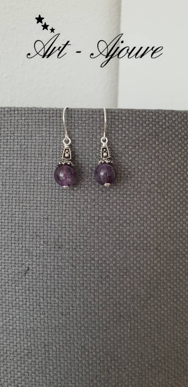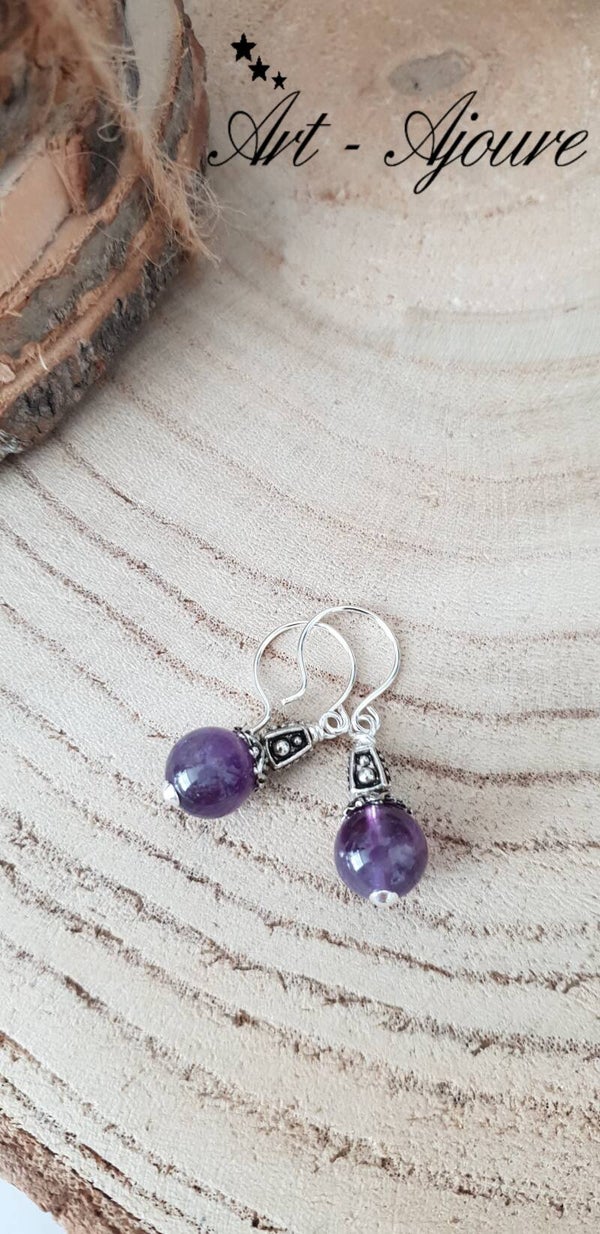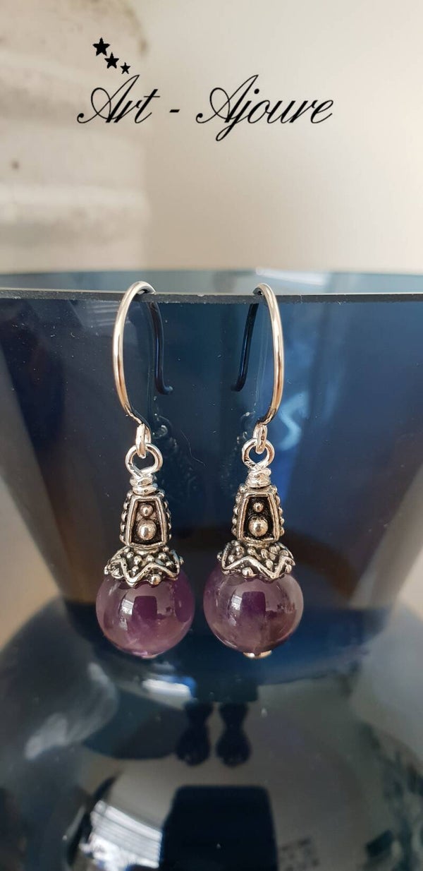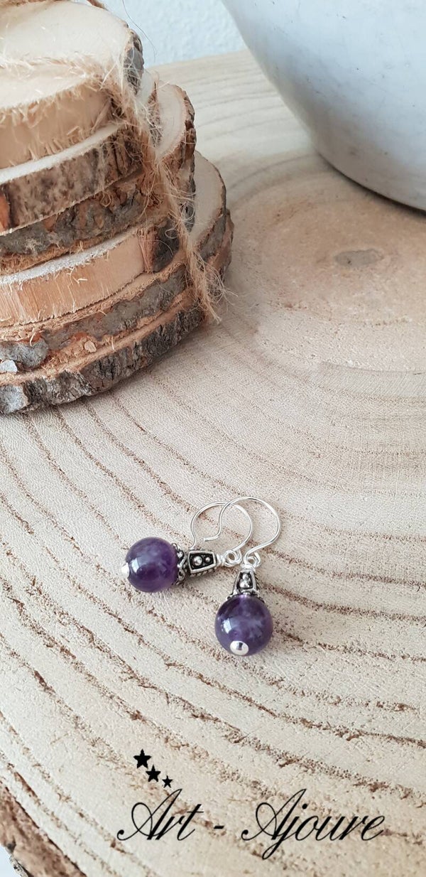 - 2 Amethyst edelstenen kralen van ongeveer 1 cm doorsnede.- Totale hoogte inclusief oorhaak is 3,5 cm.