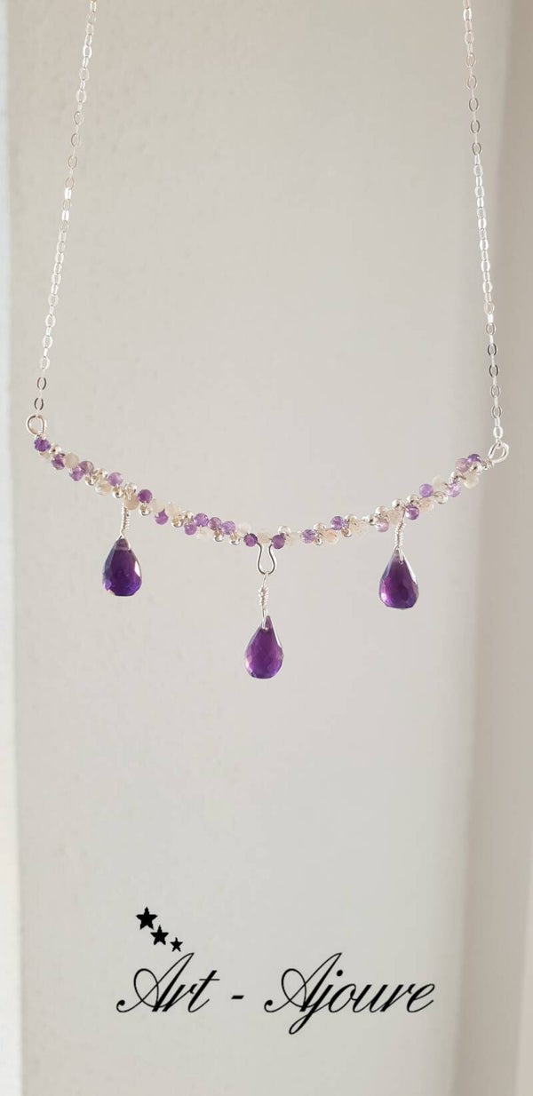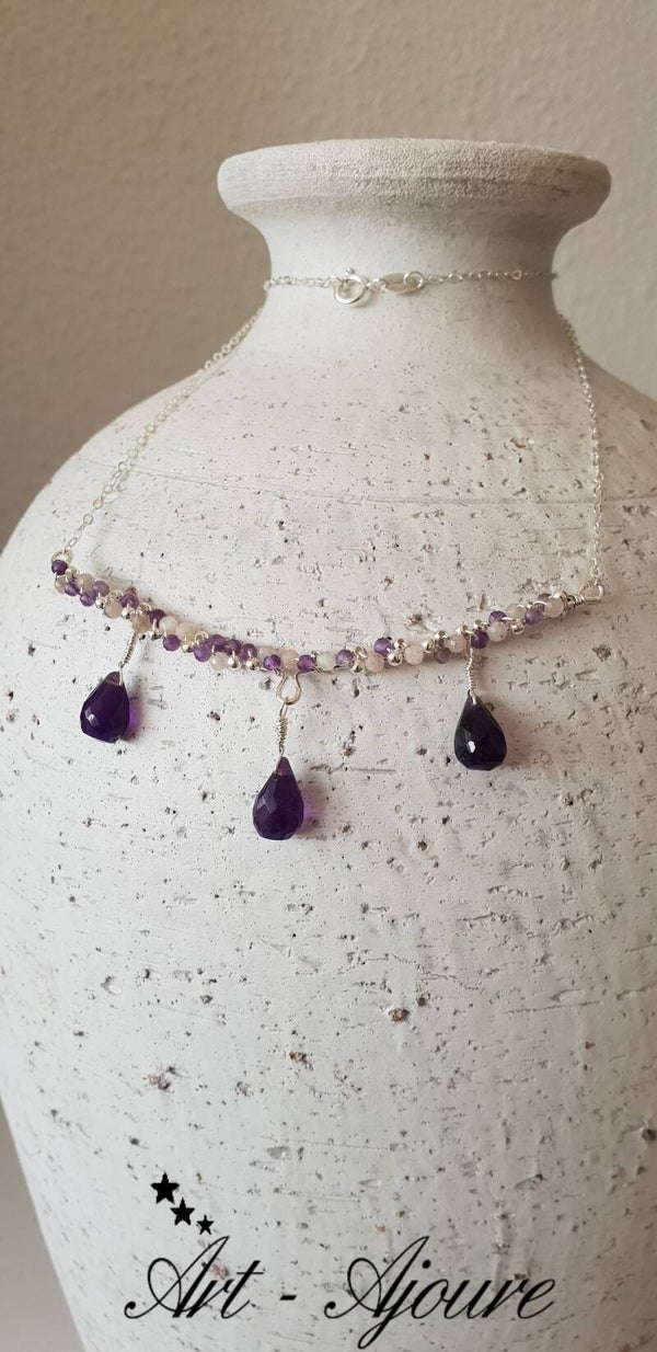Handgemaakte 925 Sterling zilver halsketting met Amethyst en Maansteen edelstenen. Deze halsketting met een totale lengte van 47 cm en een rij van 8 cm van mooie microfacetgeslepen Amethyst en Maansteen met hanger van 3 Amethyst druppels. Deze halsketting inclusief hanger is gemaakt van 925 Sterling zilver.