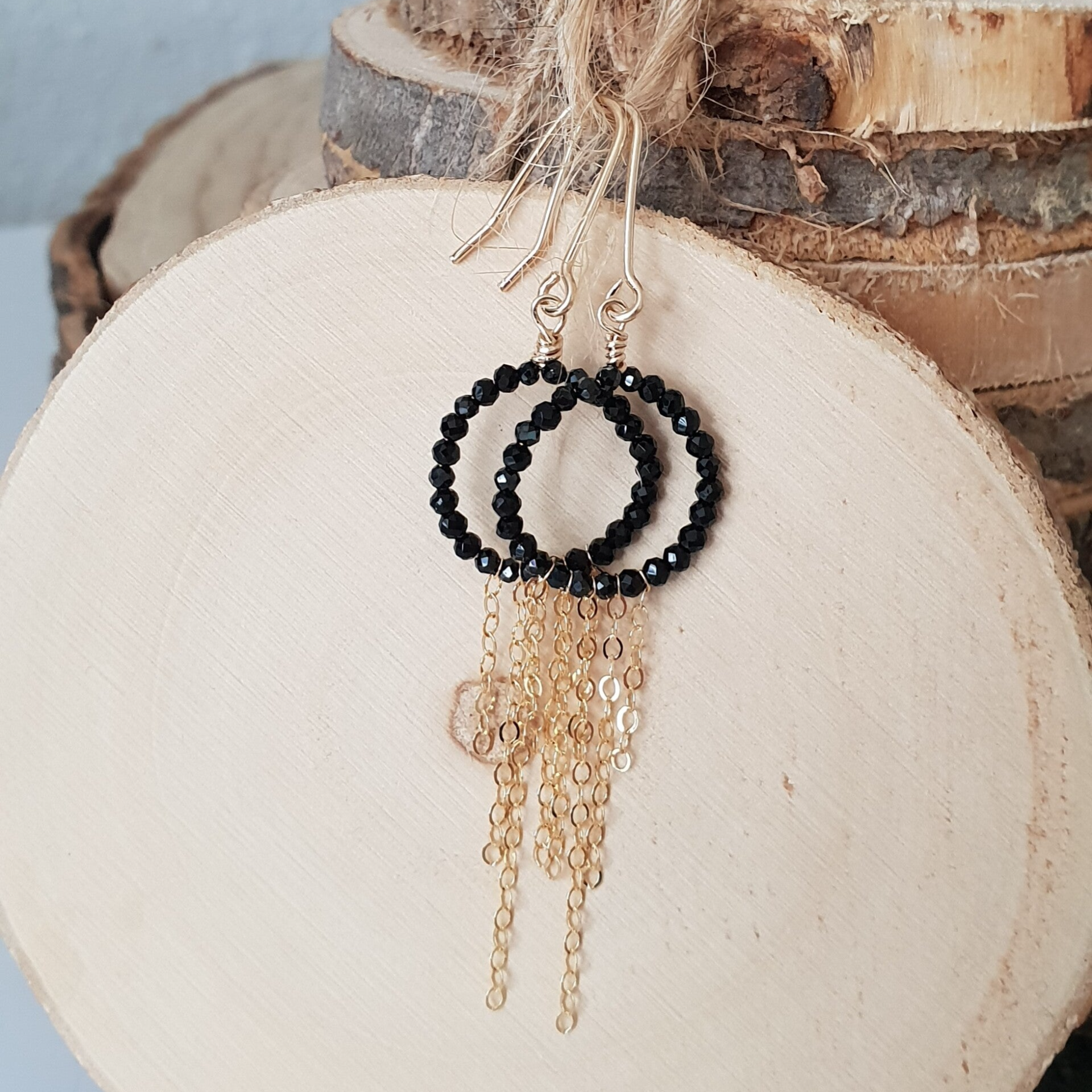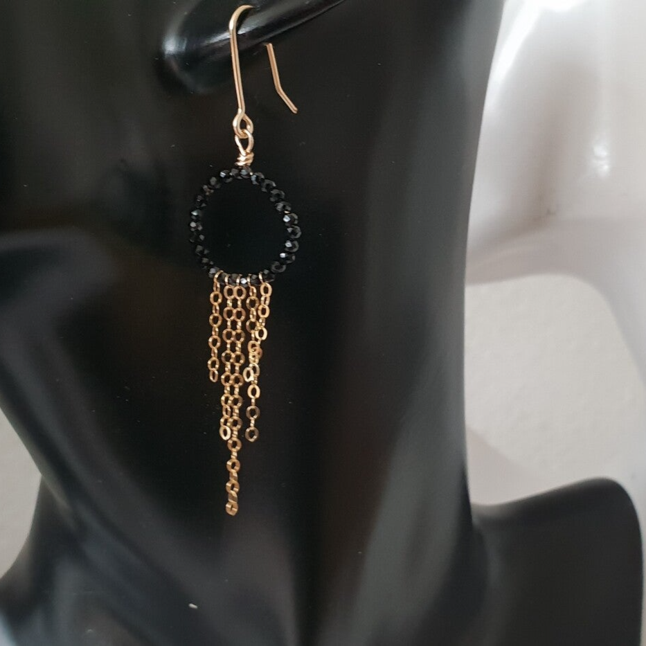 De oorbellen zijn gemaakt van puur 14k gold fill met micro facetgeslepen zwarte Spinel steentjes.