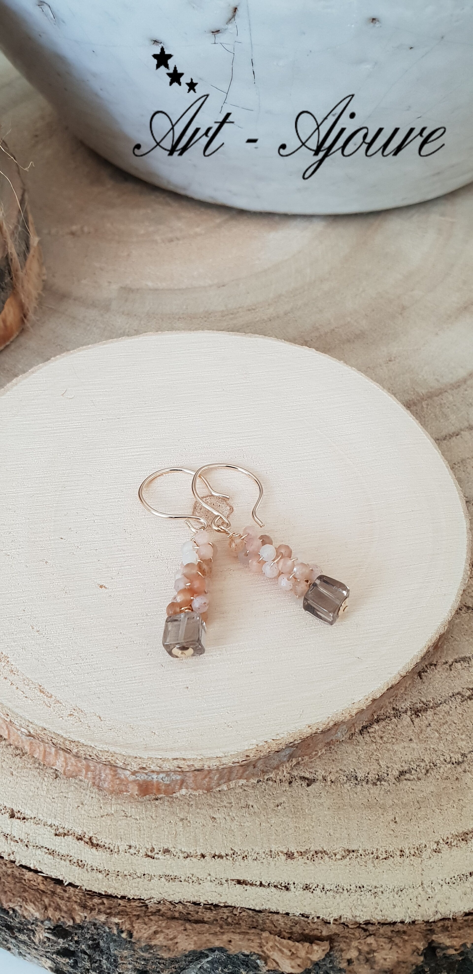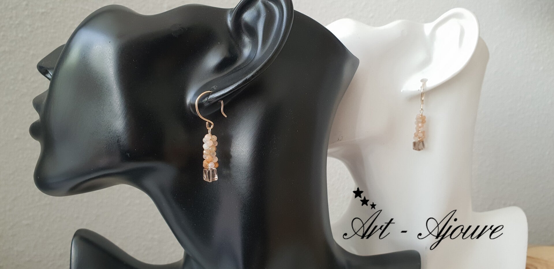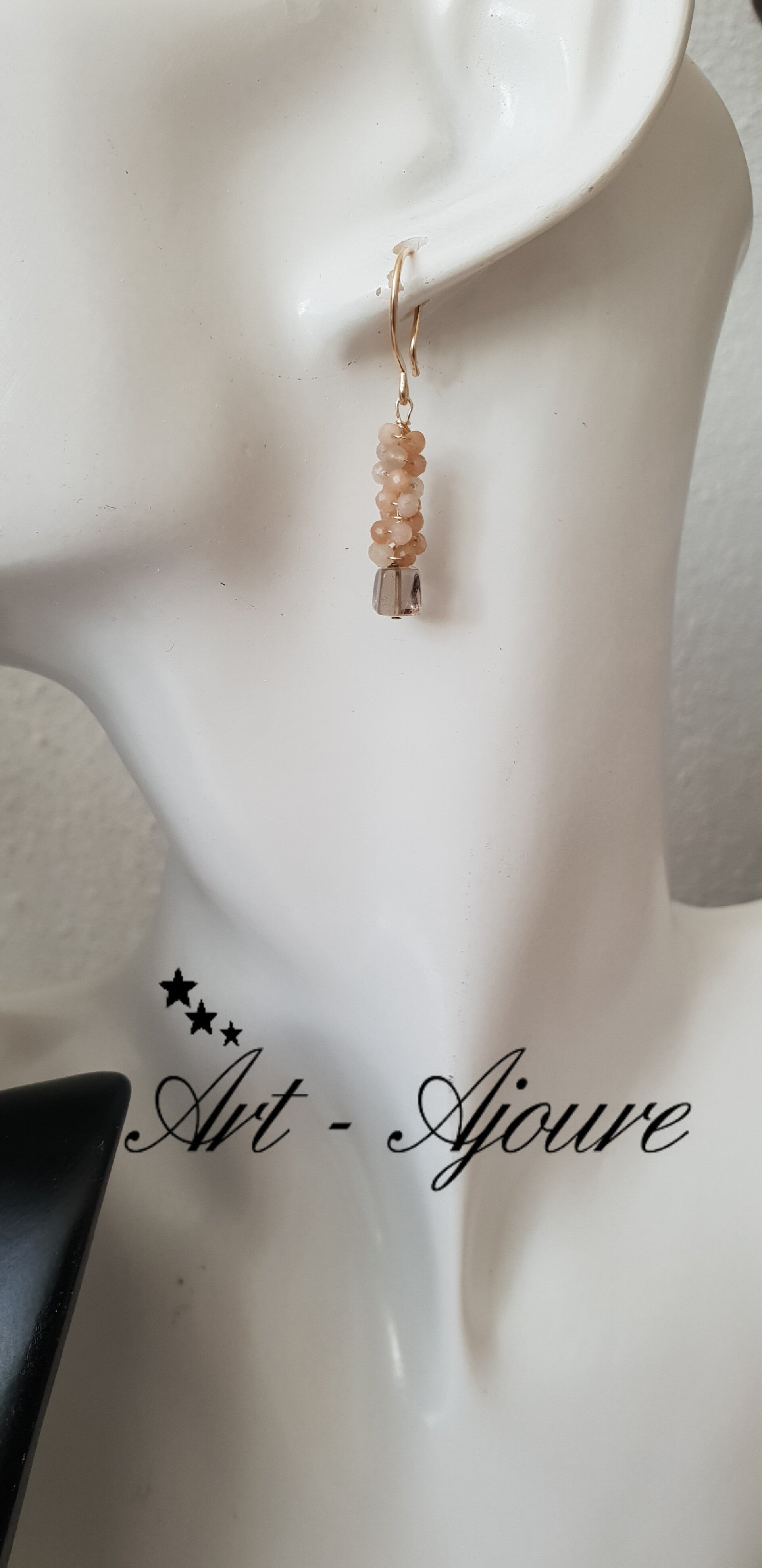 Handgemaakte Art-Ajoure 14k Gold fill oorbellen met Rokkwarts en Maansteen edelsteentjes.