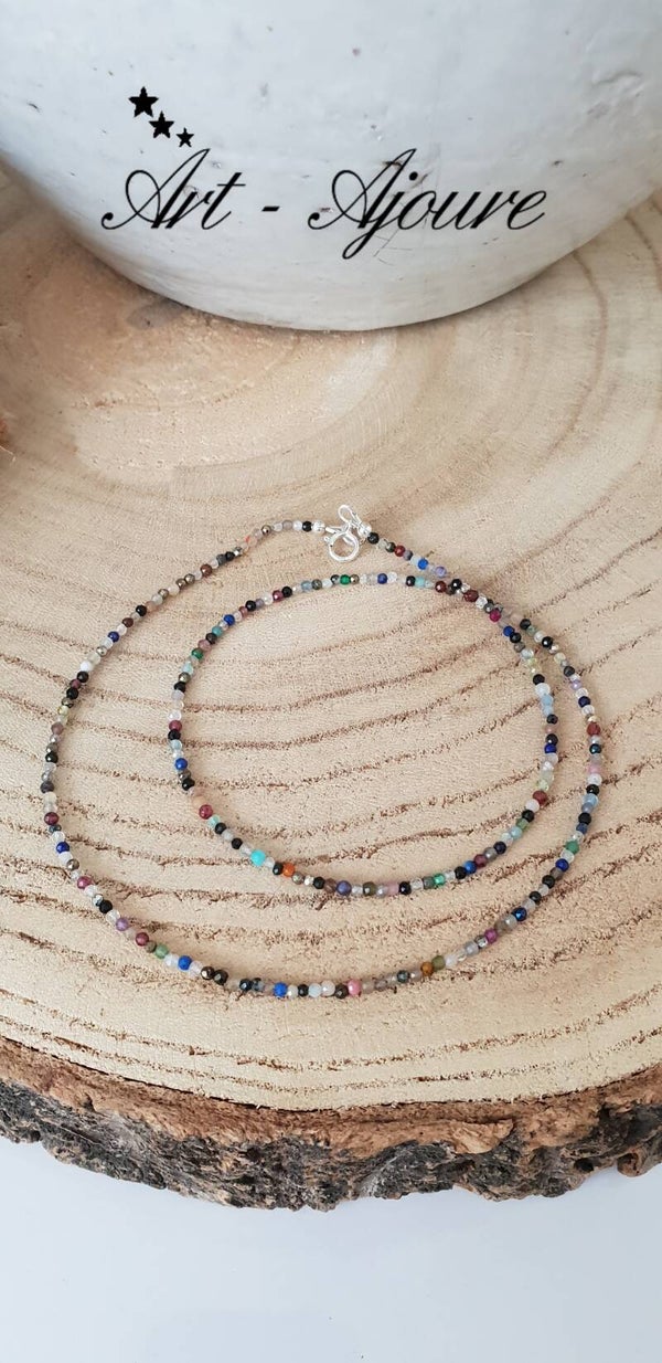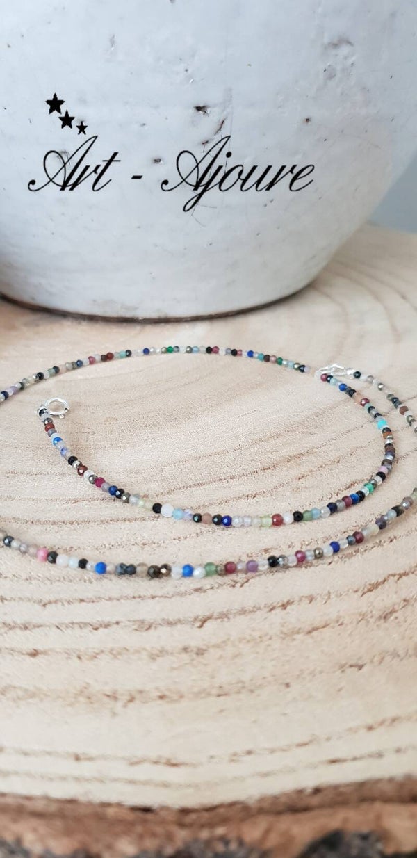 Handgemaakte 925 Sterling zilver halsketting door Art-Ajoure met heel mooie multi edelstenen. Deze halsketting met een totale lengte van 49 cm met mooie micro facetgeslepen multi edelstenen. De steentjes zijn (Rokkwarts,Rozenkwarts,Labradoriet,Lapis Lazuli,Maansteen,Granaat,Piriet,Pretiet,Uitelkwarts,Zonnsteen,Amethyst,Onyx,Spinel,Aqumarijn,Toermalijn etc) mooie en goed afgesleepen waardoor deze heel mooie glinsteren.