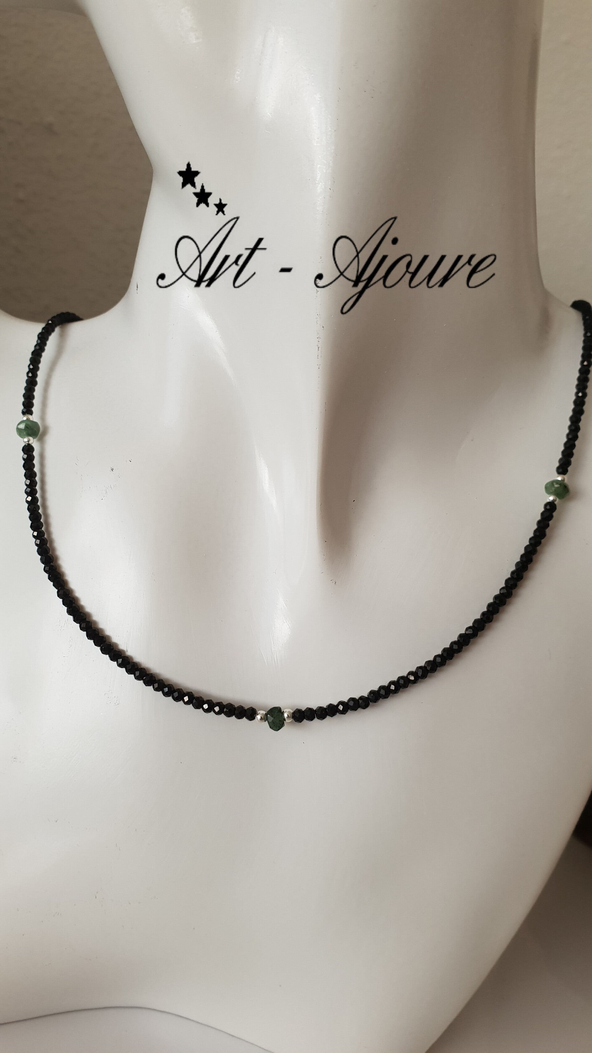 Handgemaakte zilveren halsketting door Art-Ajoure met Smaragd en zwarte Spinel steentjes.