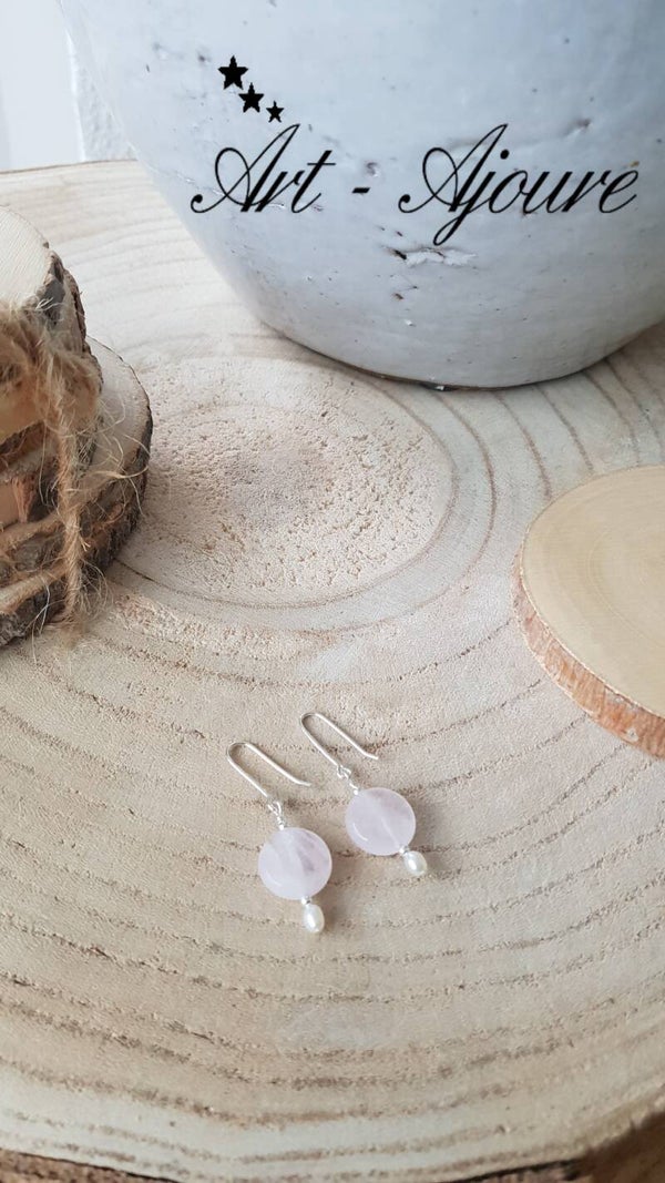 Hand gemaakte Art-Ajoure 925 Sterling zilver oorbellen met Rozenkwarts en zoetwater parel.