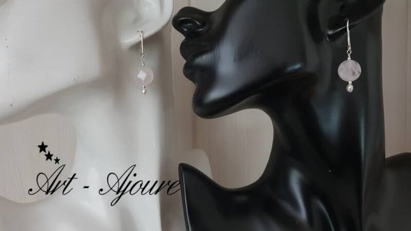 Art-Ajoure 925 Sterling zilver oorbellen met Rozenkwarts en zoetwater parel.