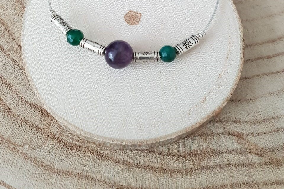 Een met de hand gemaakte zilveren spang armband met Amethyst en Onyx edelstenen.