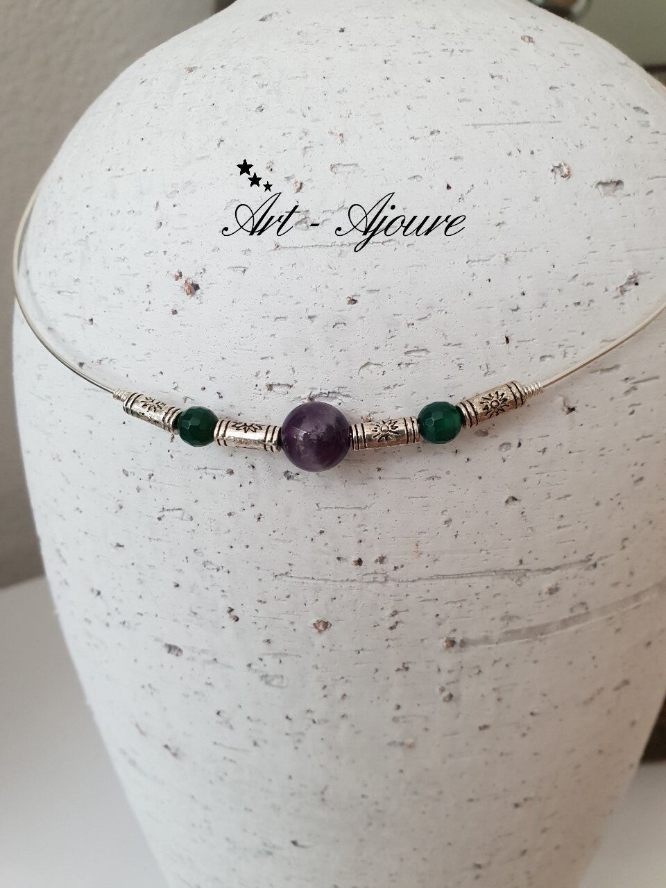 Deze spang collier heeft 2 Onyx edelstenen en 1 Amethyst edelsteen met daartussen Tibetaans zilver spacers ( Tibetaans zilver is een mengsel van zilver samen met andere metalen zoals koper. )