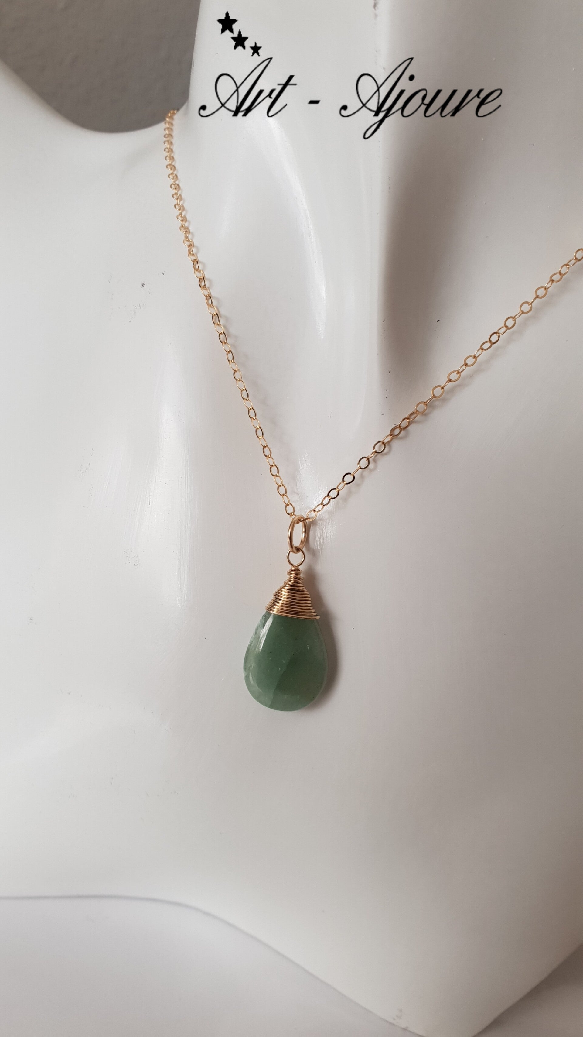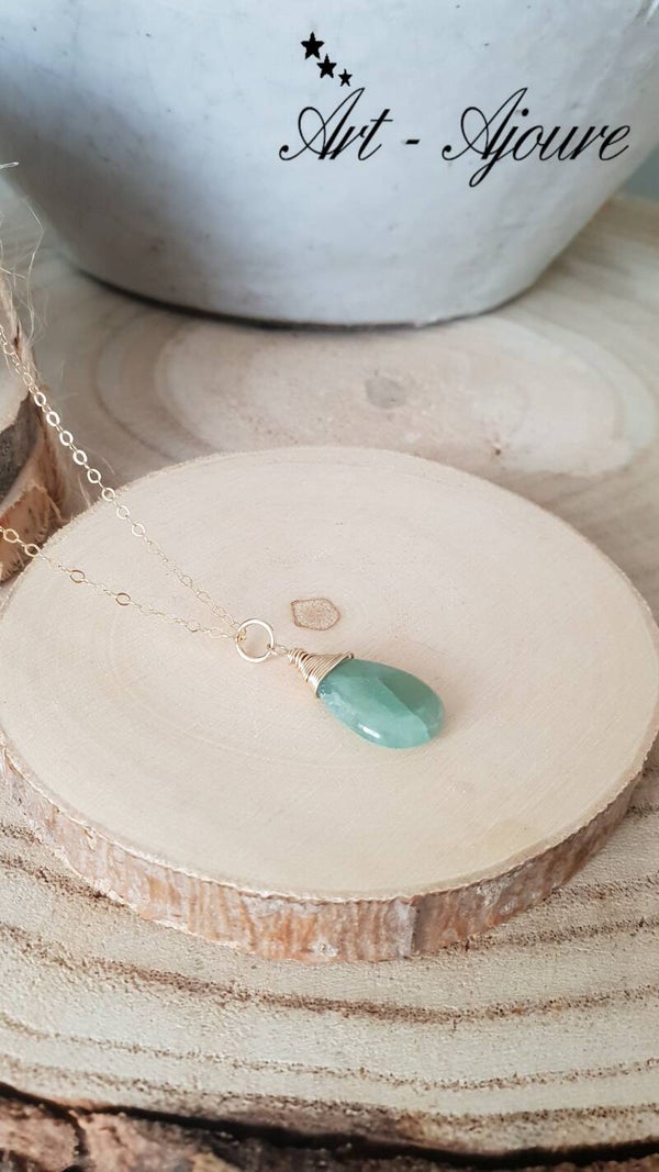 Handgemaakte Art-Ajoure 14k goldfill alsketting met hanger met Aquamarijn van maar liefst 45 cm lengte. De hanger van heel mooie licht blauwe Aquamarijn en sierlijk afgewerkt met 14k gold fill draad.